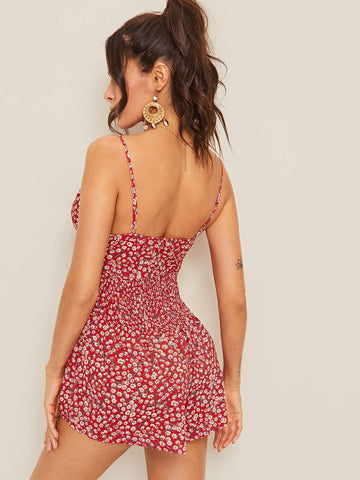 Tie Front Cut Out Shirred Detail Ditsy Floral Romper